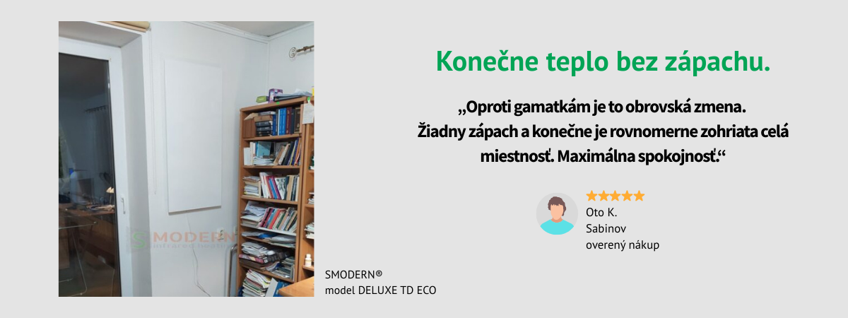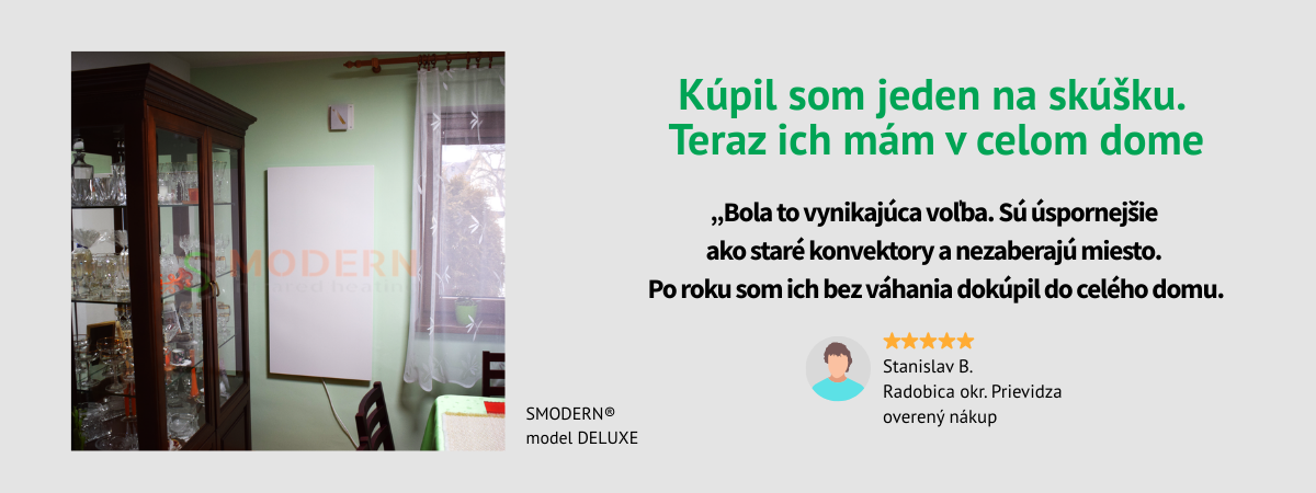 Infrapanely SMODERN® sú v súčasnej dobe TOP produkt na svetovom trhu a to ako s ohľadom na kvalitu, použité nestarnúce a bezúdržbové materiály, kvalitu spracovania, ale hlavne v oblasti úspor, kde dosahujeme vo vykurovaní minimálnych nákladov tak prevádzkových tak aj prakticky nulových nákladov na revízie a opravy.
